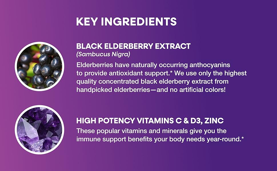 Made with elderberry, vitamin C, and zinc. Nothing fake, just pure goodness.